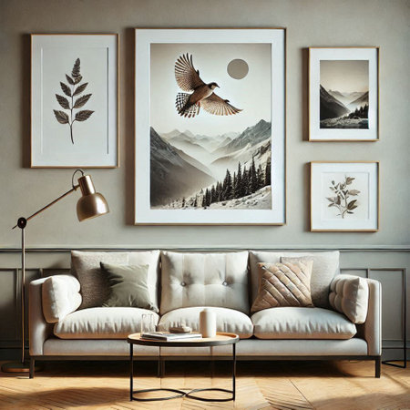 Living room interior with sofa, coffee table and picture frames on wall