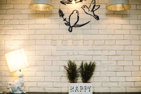 Close up view of stylish worktable with stationery, notepad, decorations and copy space on white desk white brick wall