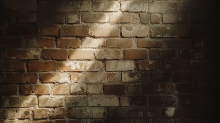 A captivating rustic brick wall illuminated by soft sunlight, creating beautiful shadows and highlighting the weathered texture for artistic backgrounds.
