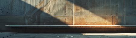 A minimalist scene capturing the tranquil simplicity of a lone concrete bench bathed in the soft glow of sunlight, creating a peaceful contrast of light and shadow on a textured wall. Ideal for themes of solitude, calmness, and modern architecture.