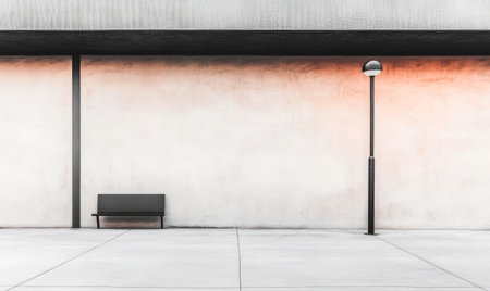 A solitary black bench sits next to a modern street lamp beside a smooth concrete wall. The evening light casts a warm glow creating a tranquil urban atmosphere at dusk.