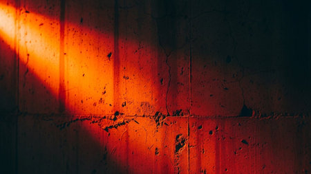 A stark and dramatic featuring a textured concrete wall illuminated by a strong beam of vibrant orange light. The light cuts across the dark surface, creating a sharp contrast between illuminated areas and deep shadows. The concrete texture is rough and uneven, with visible imperfections and subtle cracks. The composition is minimalist and abstract, with the interplay of light and shadow creating a moody and atmospheric visual.