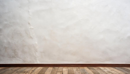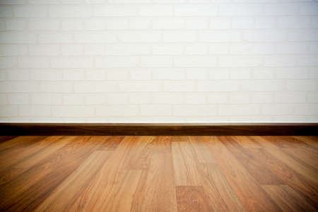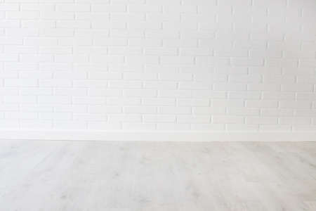 Copyspace background with an empty white bricks wall with a hardwood wooden floor below with large copy space for your text or advertisement