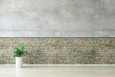 Empty Interior Room with Plant near the Stylish Dirty Brick Concrete Wall, Wooden Floor, Simple Office Trend, Fashion Conceptual Style, 3D Rendering Art Graphic Design.