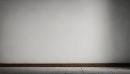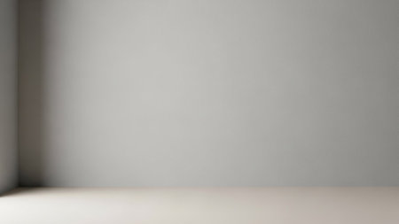 A minimalist interior corner with plain light gray walls and a softly lit floor, featuring subtle shadows and a...