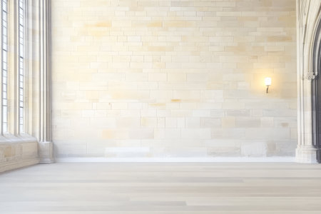 Natural light floods a spacious interior featuring large windows and smooth pale stone walls. A soft glow from a wall sconce adds warmth to the tranquil environment emphasizing architectural beauty.