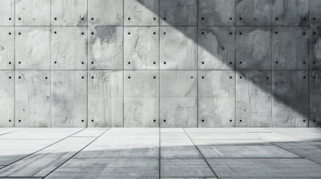 A stark and minimalistic concrete wall stands tall exhibiting subtle texture and geometric lines. Bright daylight illuminates the surface emphasizing its modern aesthetic.