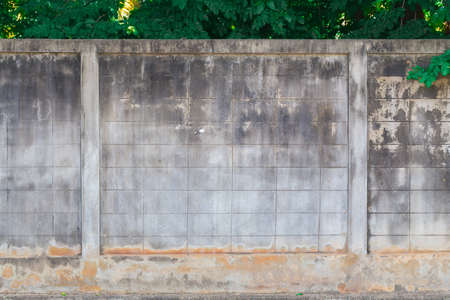 old concrete fence wall with stain and lichen background texture and tree backside