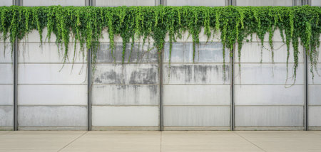 A wall constructed from large, horizontally stacked concrete panels is adorned with a dense curtain of green vines cascading from the top. Vertical metal supports divide the wall.