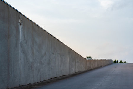 A massively high concrete security boundary wall topped with barbed wire on a blue sky background - 3D render