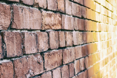 Close up of red brick wall ending in infinity with shallow DOF. Texture of old concept background
