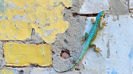 A vibrant lizard gracefully climbs a weathered wall, showcasing its bright colors against a charming yellow and blue backdrop in its natural habitat.