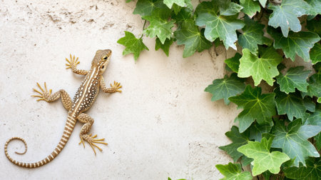 A brown lizard gracefully climbs a textured wall while surrounded by lush green ivy leaves, showcasing the beauty of wildlife in an outdoor setting.