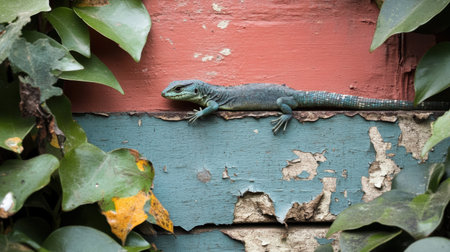 A vibrant lizard climbs a textured brick wall, surrounded by green ivy leaves, showcasing the harmony of wildlife in an urban setting, offering a unique visual appeal.