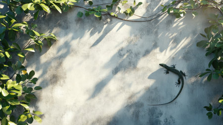 A serene close-up image of a green lizard positioned on a weathered wall, intertwined with lush foliage casting soft shadows, embodying natural beauty and tranquility.