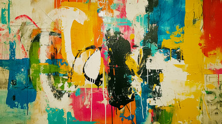 A colorful graffiti wall with splatters of paint and a black and white drawing of a face. Scene is chaotic and energetic, with the colors and patterns creating a sense of movement and excitement