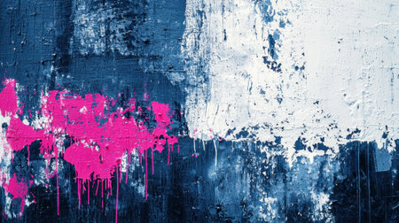 Bright and bold abstract wall art showcases vibrant pink drips against a dark blue and white textured background. The adds composition energy to the modern environment.