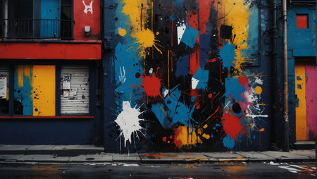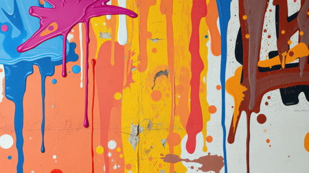 Colorful paint drips create an abstract art display on a textured wall in a vibrant urban environment