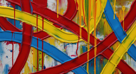 A dynamic canvas featuring bold, overlapping lines and energetic paint drips in a spectrum of colors.