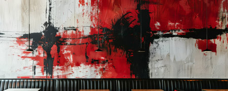 An artistic texture on a wall featuring abstract brushstrokes in red and black, creating a bold and striking visual effect.
