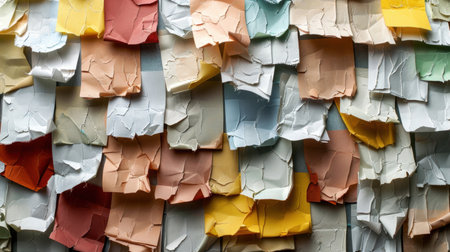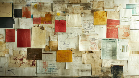A visually rich collage of various notes and sketches arranged on a wall, showcasing texture and color diversity perfect for creative and artistic projects.