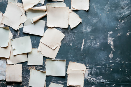Multiple torn paper notes are randomly placed on a worn dark surface creating an artistic and textured arrangement with a rustic feel.