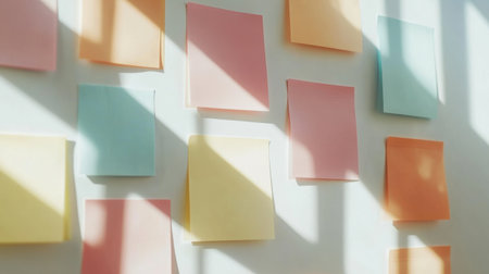 Vibrant, colorful sticky notes arranged on a wall, illuminated by soft sunlight, creating a playful and organized atmosphere in a creative workspace.