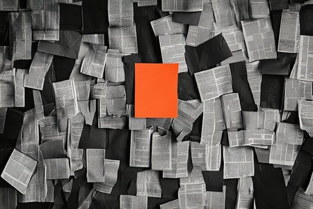 A striking composition of black and white newspaper clippings with a bold orange accent