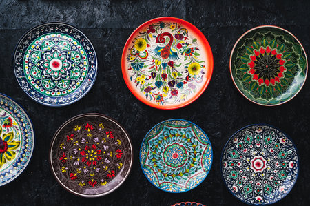 traditional oriental Uzbek ceramic plates hand-painted on black background