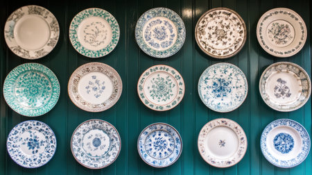 This image features a beautiful collection of vintage decorative plates arranged on a green wooden wall, showcasing artistic patterns and craftsmanship.