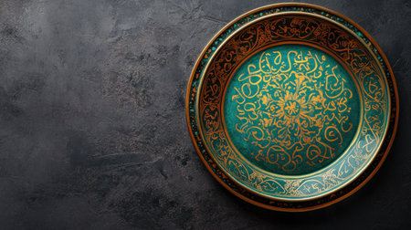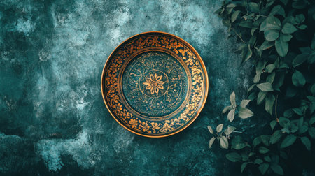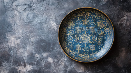 An artistic photograph showcasing an ornate blue plate adorned with intricate golden floral designs, placed on a textured gray surface, ideal for decoration.