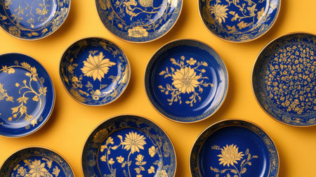 This captivating image features an arrangement of elegant blue and gold decorative plates on a vibrant yellow background, showcasing intricate floral designs and artistic craftsmanship.