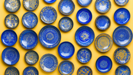 An exquisite arrangement of blue and gold plates showcases intricate patterns against a cheerful yellow background, highlighting craftsmanship and artistic design.