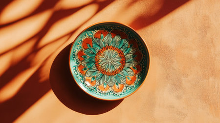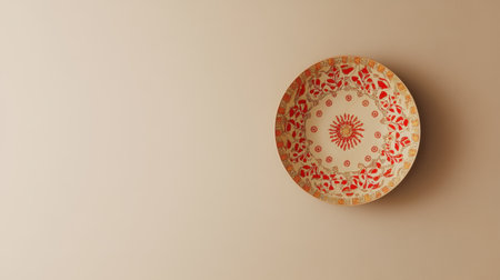 A beautifully crafted traditional plate rests against a vibrant red and orange background, featuring intricate designs that reflect cultural artistry and craftsmanship.