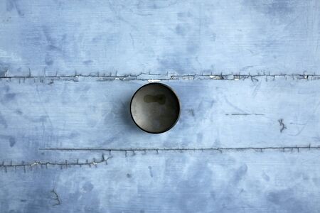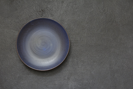 Blue round porcelain empty plate on a black stone background. Empty plate top view.