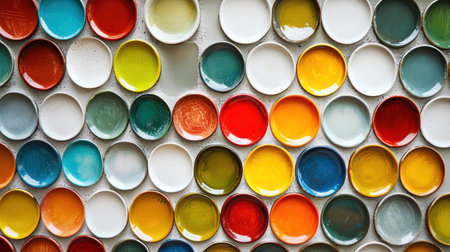a collage of colorful ceramic plates mounted on a white wall, created with generative ai