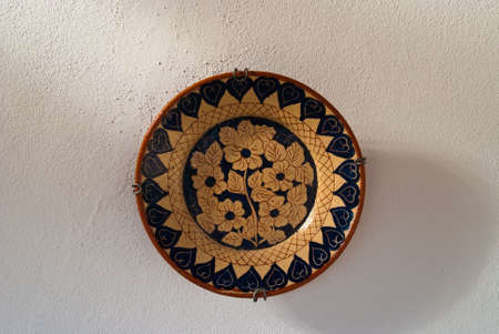 SAGRES, PORTUGAL - OCTOBER 13,2015: portuguese handcrafted, colorful decorated plates on the wall - traditional ceramic.