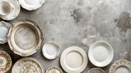 A beautifully arranged collection of vintage tableware featuring various elegant dishes on a rustic gray background, perfect for design inspiration.