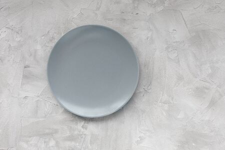 Empty plate on gray background. Cooking, meal and food concept. Top view, flat lay, copy space