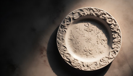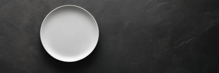 Positioned on a dark, textured tabletop, a blank ceramic plate invites creativity and culinary artistry. The surrounding neutral space enhances its pristine surface, making it a versatile piece for various dining settings. This ceramic plate serves as a canvas for food presentation, perfect for intimate dinners or casual gatherings. The compositions highlight the beauty of minimalism, encouraging the imagination of chefs and hosts alike.