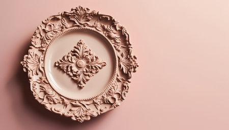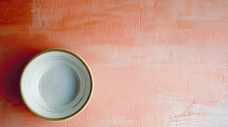 photo of a ceramic white plate with a gold rim, placed at the bottom-left of a warm pastel coral background. Subtle highlights on the plate enhance the minimalist aesthetic, isolated on pastel coral background --no people man woman --chaos 12 --ar 16:9 --style raw --stylize 250 --weird 150 --v 6.1 Job ID: c0d345d7-117f-4ebe-ab9f-6fb985fbb5fb