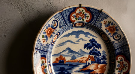 A close-up of a vintage hand-painted ceramic plate, likely Dutch Delftware, hanging on a textured wall. The plate features a classic blue, white, and orange design with a central landscape scene and floral border motifs.