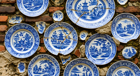 A collection of blue and white patterned porcelain plates and fragments are displayed on a rough,aged wall. Several of the plates are broken and have been repaired with gold,illustrating the Japanese art of Kintsugi,which celebrates imperfection and history.