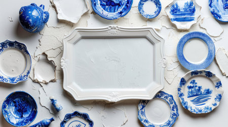 A visually captivating arrangement of broken ceramics and a white frame on a textured background, emphasizing blue and white patterns with artistic flair.