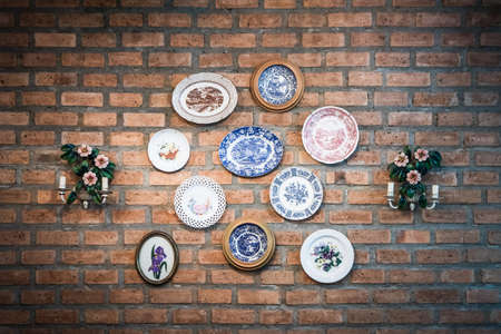 Beautiful old dish on the wall in Thai restaurant at True Digital Park Community Mall, Sukhumvit road, Bangkok, Thailand, June 18, 2020