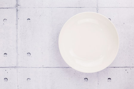 A simple white plate rests on a textured gray surface, embodying minimalism and elegance. Ideal for showcasing culinary creations and enhancing dining settings.