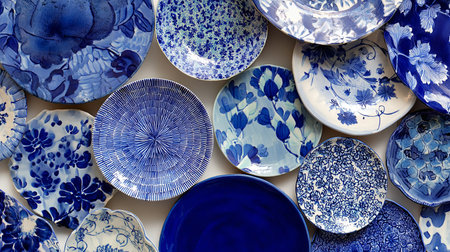 A beautiful collection of various vintage and antique ceramic plates displayed on a wall. The plates feature intricate designs, mostly in classic blue and white patterns, but also include some with brown and multicolored illustrations. This image represents collecting, antiques, tradition, and decorative art.