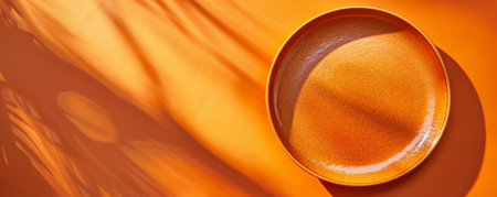 Festive concept with a blank saffron plate on a saffron table, viewed from above. The warm saffron hue evokes a festive and energetic vibe. Ample space for text.
