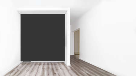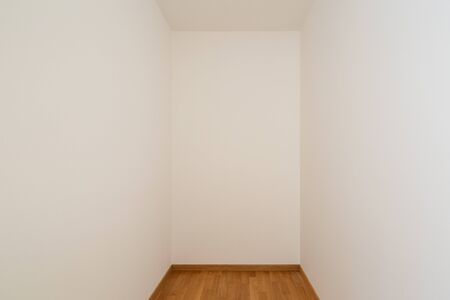 Empty white room with white walls and light parquet. Nobody inside