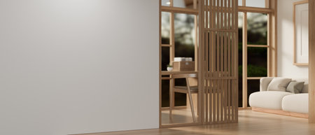 Empty mockup white wall in a modern, Scandinavian, and spacious living room. 3d render, 3d illustration